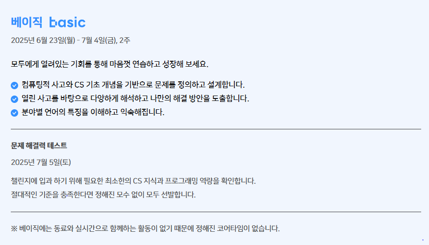 - 제가 느끼기에 베이직 과정에서 출제되는 미션과 CS지식들 모두 문제 해결력테스트에 도움이 됩니다.