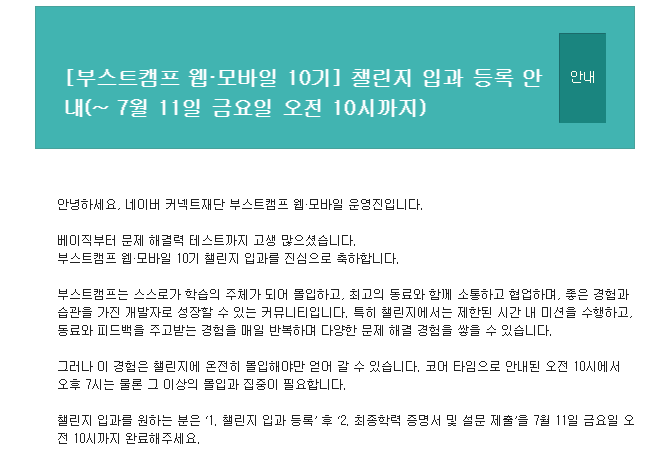 이번 네이버 부스트캠프 10기 웹·모바일 과정은 따로 선발 과정은 있지 않았습니다.