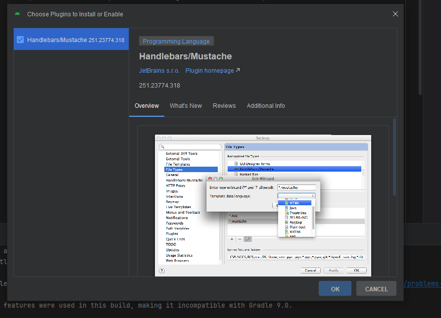 위 와같이 Install Handlebars/Mustache plugin이 뜨는데 클릭해줍니다.