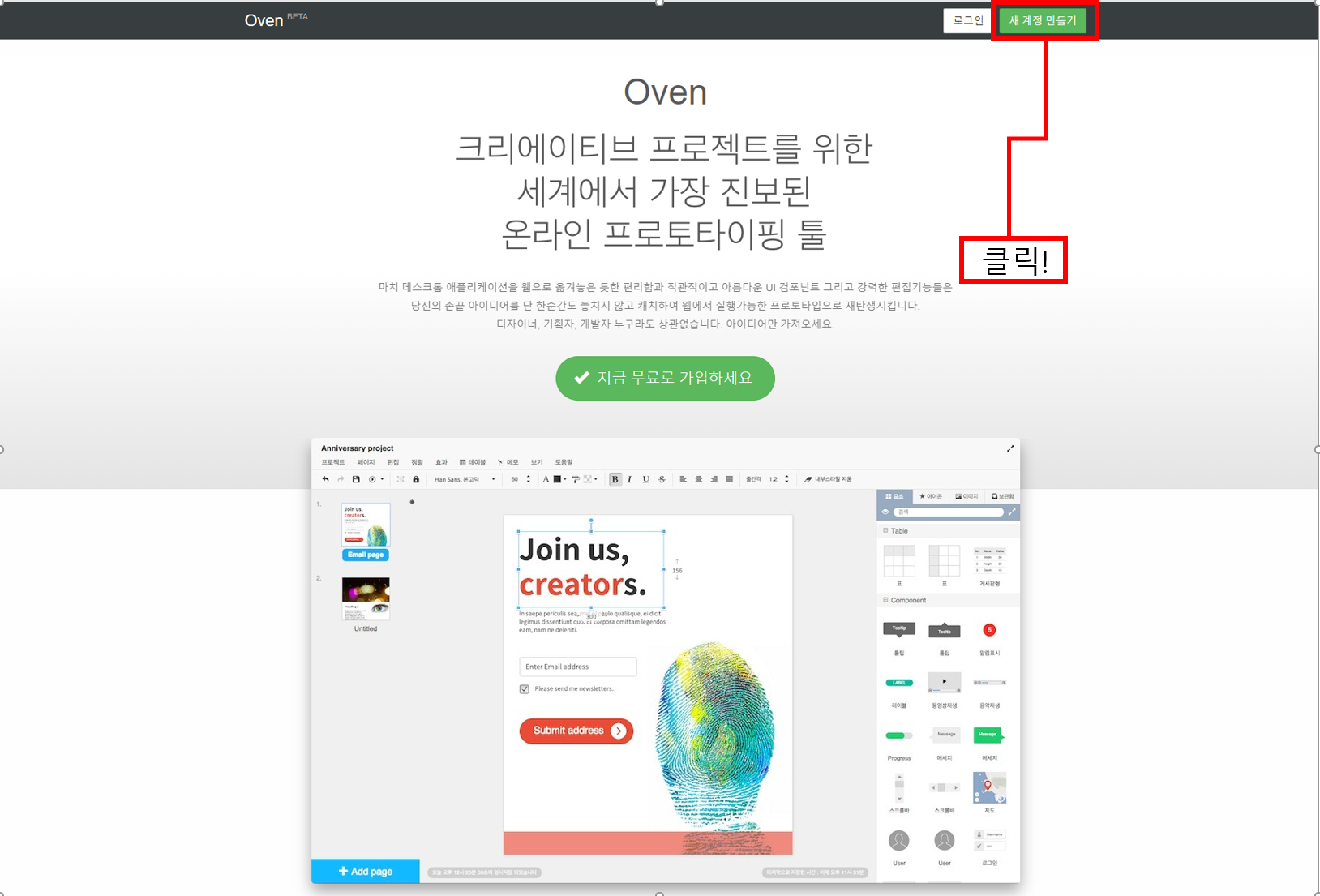 Oven(오븐)은 HTML5 기반의 무료 웹/앱 프로토타이핑 툴입니다. (카카오 제공)