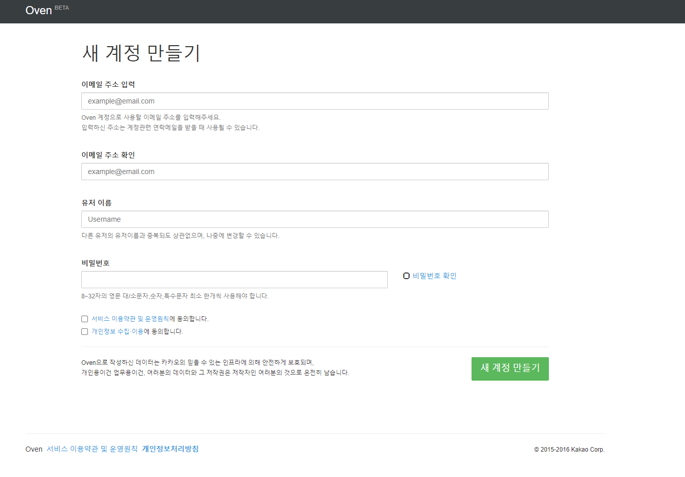 '새 계정 만들기'에서 자신이 사용할 이메일 주소를 입력하고 유저이름, 비밀번호를 입력 후 우측 하단의 '새 계정 만들기'를