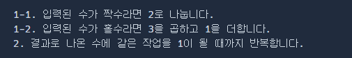 여기서 원하는 답은 결국 콜라츠 추측 공식은 결국 마지막엔 1이 돼야 합니다.