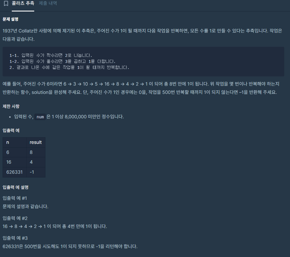 여기서 주의할 점은 num이 1이라면 0을, 이 작업이 500번 반복할 때까지 1이 되지 않는 다면 -1을 반환해야 합니다.