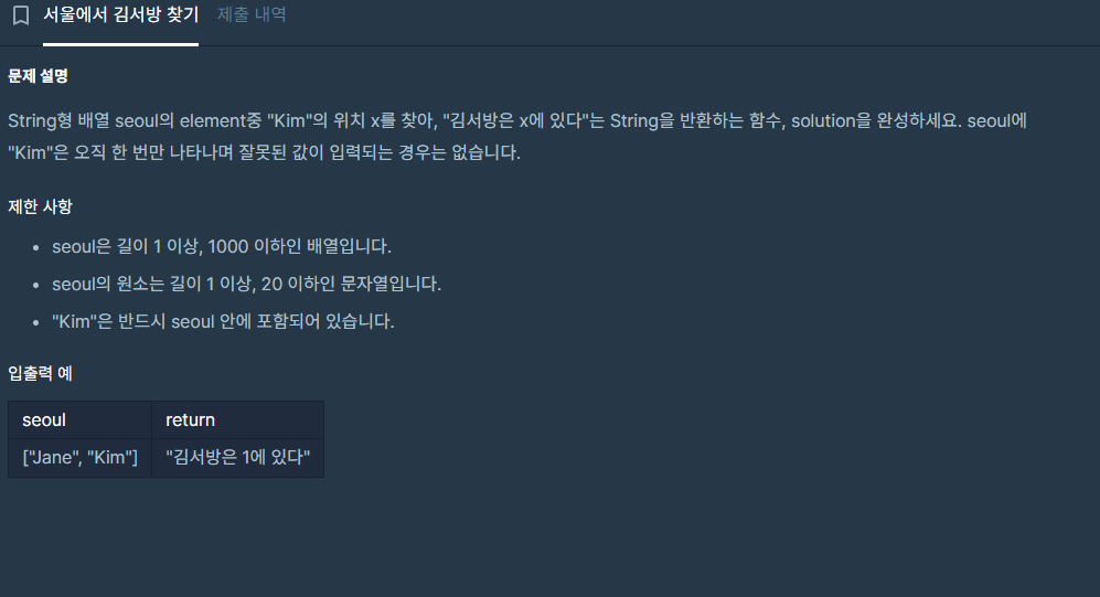 seoul이라는 String배열에서 0부터 반복했을 때 seoul의 x위치에 "Kim"이 있다면 answer을 반환해 줍니다.
