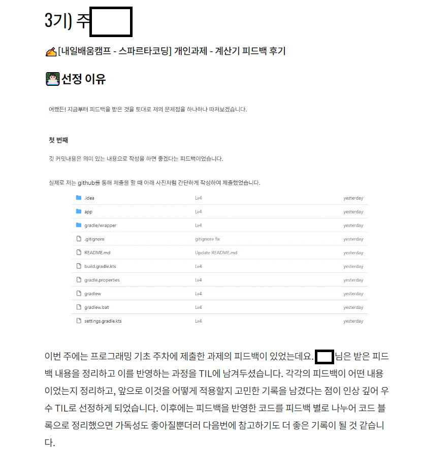 내일 배움 캠프 블로그를 가보니! 3월 10일에 작성했었던 계산기 과제 피드백 후기가 선정되었던 것이었습니다!