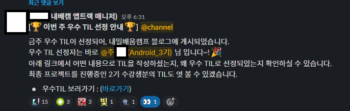 알고 보니 이렇게 한 주마다 각 트랙별로 금 주의 TIL을 선정해서 블로그에 게시된다고 합니다.