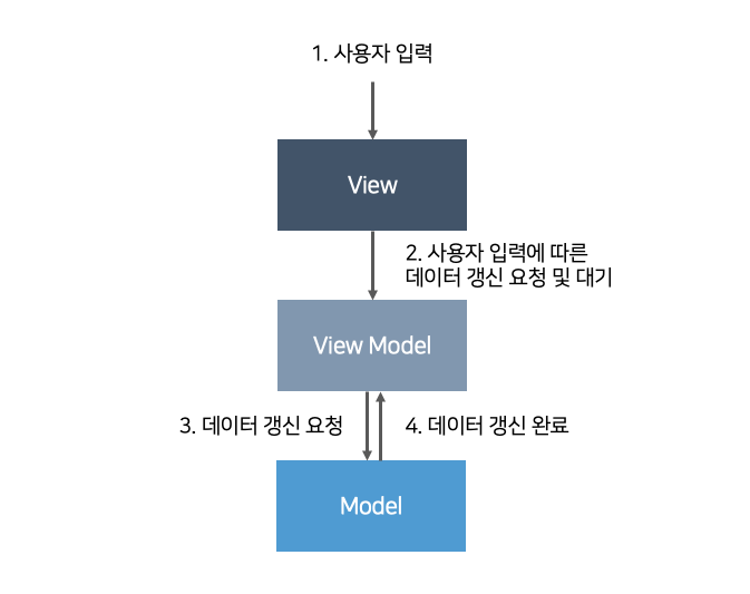 또한, MVP(Model-View-Presenter) 패턴과는 다르게 ViewModel은 Model을 가지고 있지만 View는 가지고 있지 않습니다.